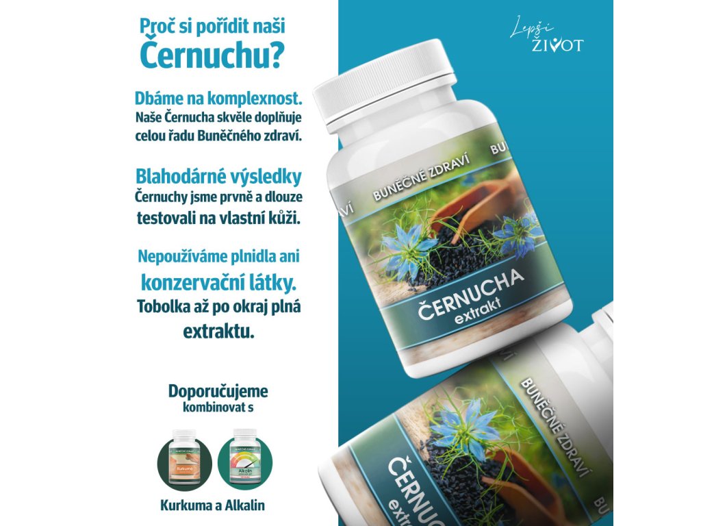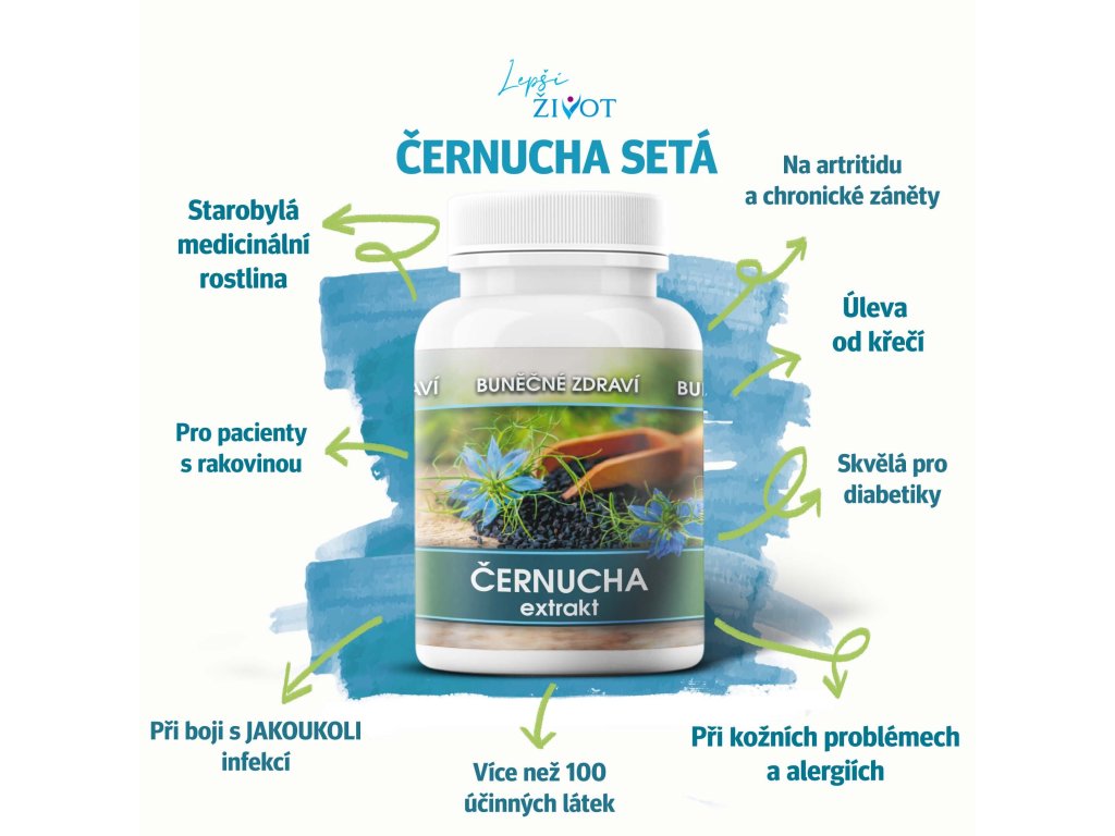 Černucha setá, lidově Černý kmín, je starobylá rostlina používaná po staletí v tradiční medicíně na celou řadu zdravotních problémů. Drobná semínka Černuchy seté obsahují více než 100 účinných složek. Extrakt 10 : 1 přináší koncentrované spektrum těchto bioaktivních látek.