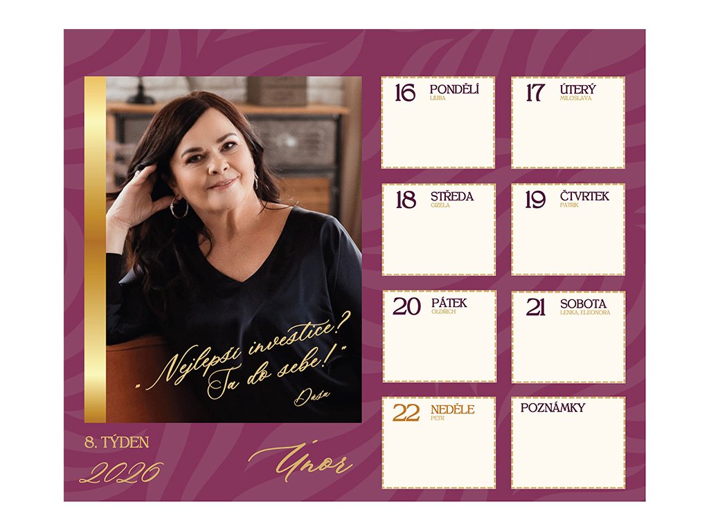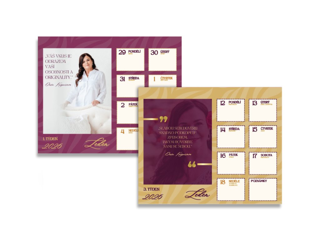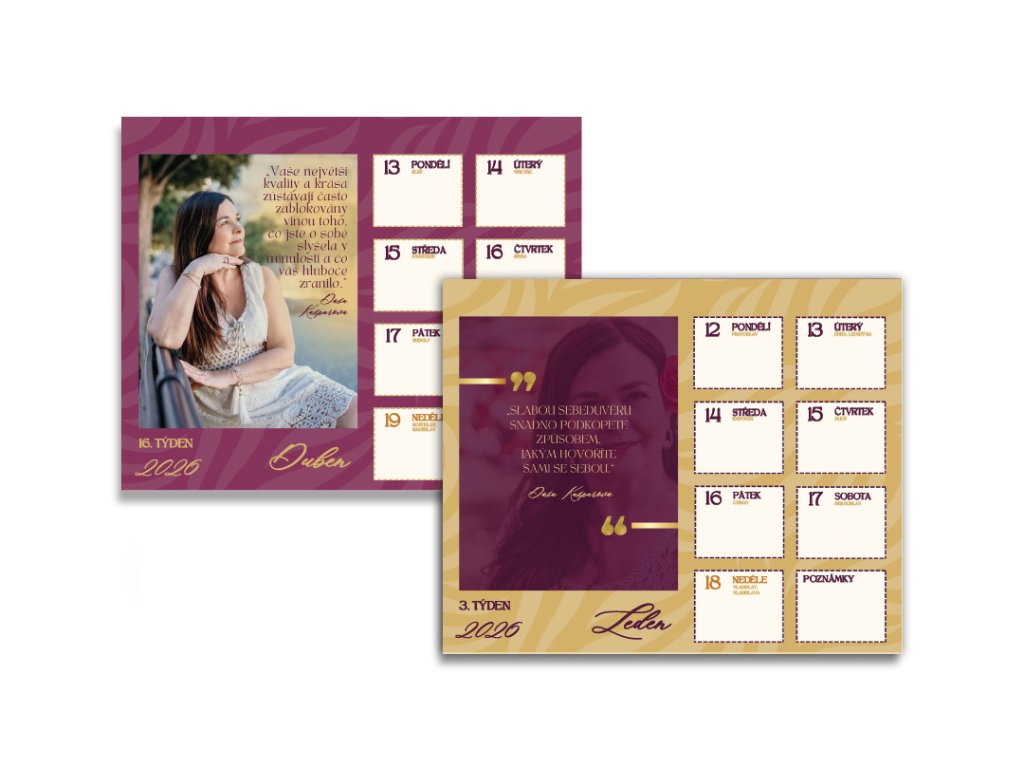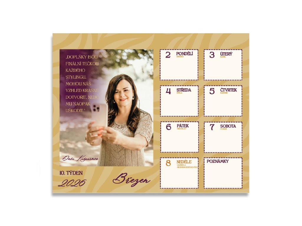 Jedná se o týdenní plánovací kalendář, kde každý týden najdete čerstvou inspiraci, tip nebo posilující myšlenku, která vám pomůže vypadat a cítit se skvěle. A když ho budete mít na očích každý den, tak věřím, že vám pomůže zlepšit nejen každodenní pocit. Dokáže prozářit i vaše dny.